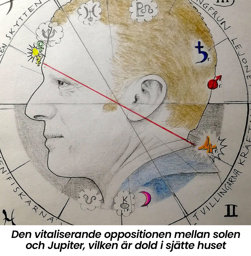 Sextilen mellan solen och Saturnus ger i sig en respekt för tradition och ordningsamhet och återfinns hos många naturer som är betydligt mer konservativa, återhållsamma och formella av sig. Att Jupiter är med ger honom arbetskapacitet och pliktkänsla. Vilket inte är samma sak som samvete, även om det kan se likadant ut, och tjäna som ett substitut.